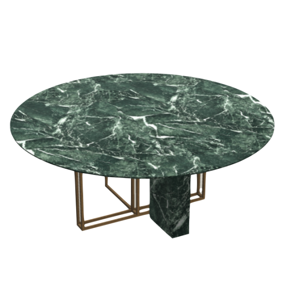 Tässä pyöreässä pöydässä -malli XW- vihreä Alpi marmori yhdistyy messinkirunkoon. Saatavilla myös koossa ø 180 cm.