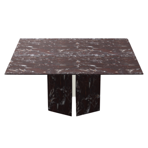 Tässä neliönmuotoisessa 2K pöydässä on kuitenkin blokkimaiset marmorijalat ja materiaalina on Jasper Red marmori, mattana. Saatavilla myös koko 180x180 cm.