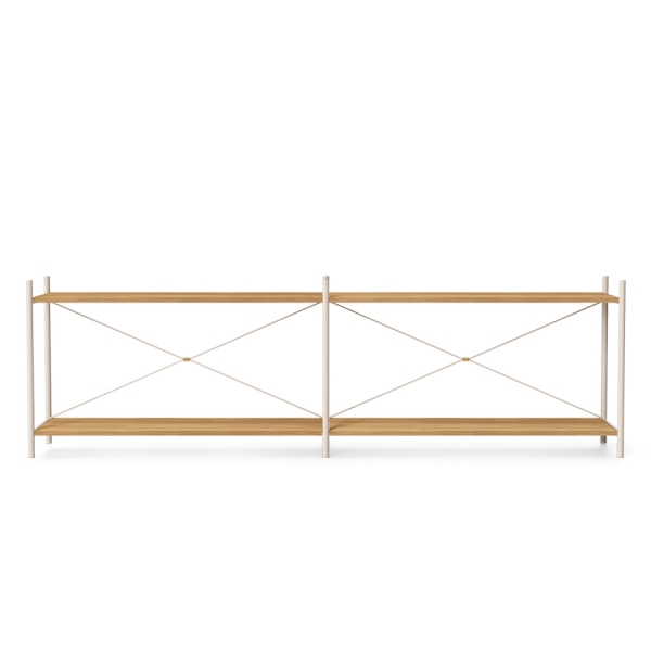 Tämä Punctual -hyllykokonaisuus sisältää 3 kpl ”Ladder 2” pystyelementtiä, 4 kpl öljyttyjä tammisia hyllylevyjä sekä kaksi tukiristikkoa.