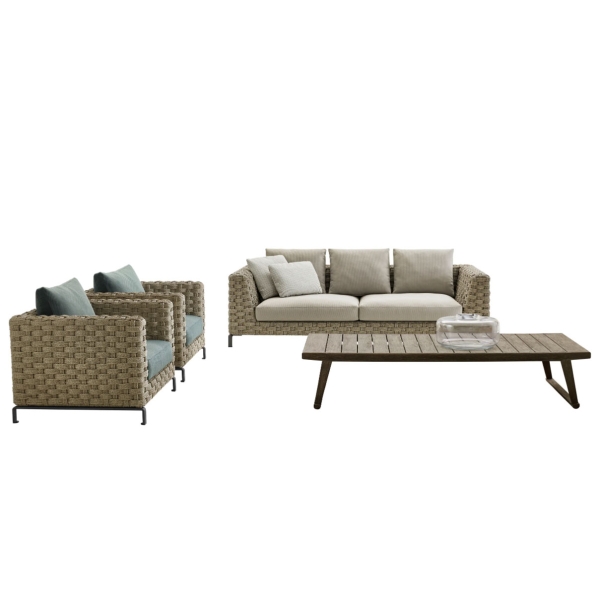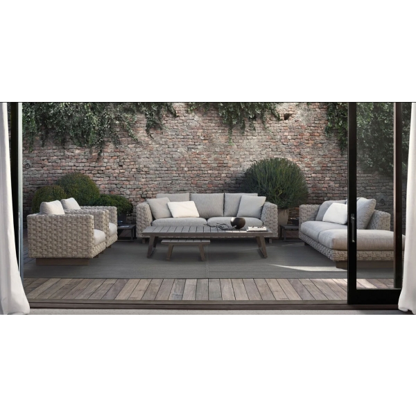 B&B Italian Ray Outdoor Natural ulkokalustesarja lainaa muotokielensä Ray-sohvalta, varioiden sitä ulkokäyttöön sopivilla materiaaleilla ja rakenneratkaisuilla. Nojatuolin runko on alumiinia ja Manila-hamppua muistuttavaa tekstiilipunosta. Ray Outdoor Natural sulautuu harmonisesti ympäröivään luontoon.