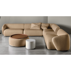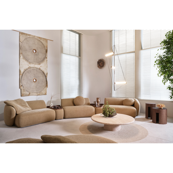 MITAT: modulit: Corner - 152 cmx107 cm + Pouf rectangular - 63 cm x 104 cm + Terminal element 150- 152 cm x 107 cm + Unit 160 - 160 cm x 107 cm + Terminal element 150- 152 cm x 107 cm + Padded low table Circle dia 103 cm, korkeus 73 cm ja istuinkorkeus 46 cm + 2 Cushions 75 cm x 75 cm - kokonaismitta 419 cm x 365 cm + tarjotinpöytä dia 103 cm