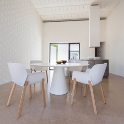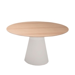 Reverse -pöytä on loistava esimerkki monikäyttöisestä pöydästä, joka on samalla sekä käytännöllinen että tyylikäs. Raskas, yksinkertainen pöydänjalka, joka on tehty 100 % kierrätetystä polyeteenistä, on täytetty hiekalla mahdollisimman tukevan kokonaisuuden takaamiseksi. Keskijalkaisen pöydän ääreen mahtuu monta istujaa, ja monenlaista tuolia.
