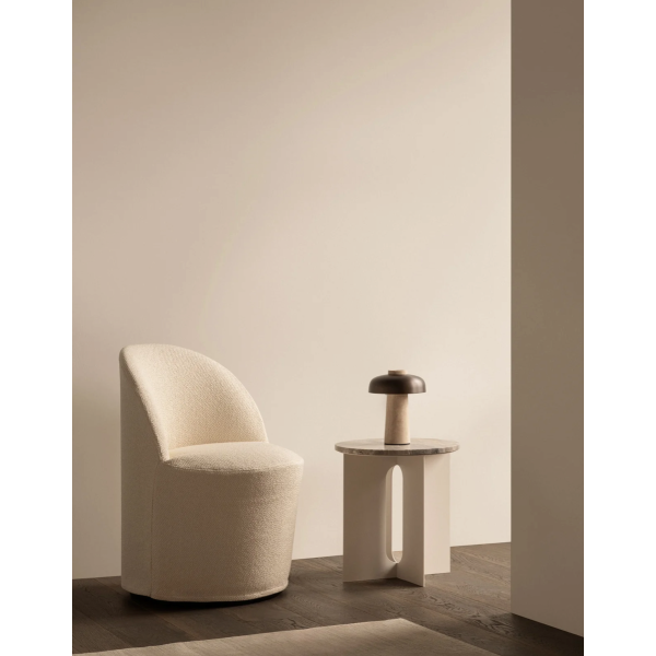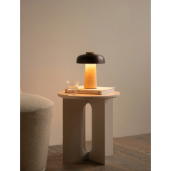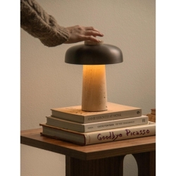 Kartiomainen jalusta on valmistettu käsittelemättömästä kivestä, ja sen luonnolliset epätäydellisyydet korostavat sen orgaanista kauneutta. Jalustaa täydentää kaareva, pronssinen alumiinivarjostin, jonka sileä, kiillotettu pinta luo silmiinpistävän tekstuurien kontrastin.