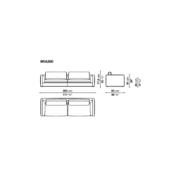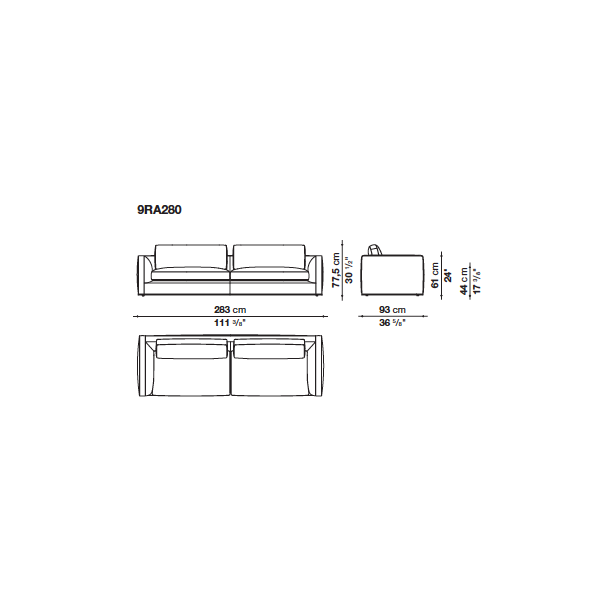 Mitat: leveys 283 cm, syvyys 93 cm, korkeus 77,5 cm, käsinojien korkeus 66 cm, istuinkorkeus 44 cm, jalkojen korkeus 3,5 cm