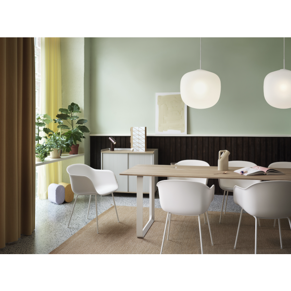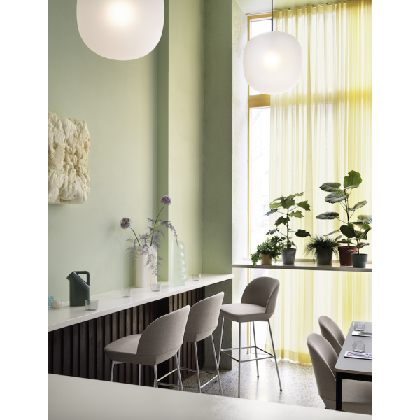 Isokokoisessa Rime riippuvalaisimessa minimalistinen muotokieli yhdistyy runollisesti ja tasapainoisesti kaunismuotoiseen, hiekkapuhallettuun lasikupuun. Näin valaisin myös luo ympärilleen mahdollisimman paljon valoa joka ei häikäise.