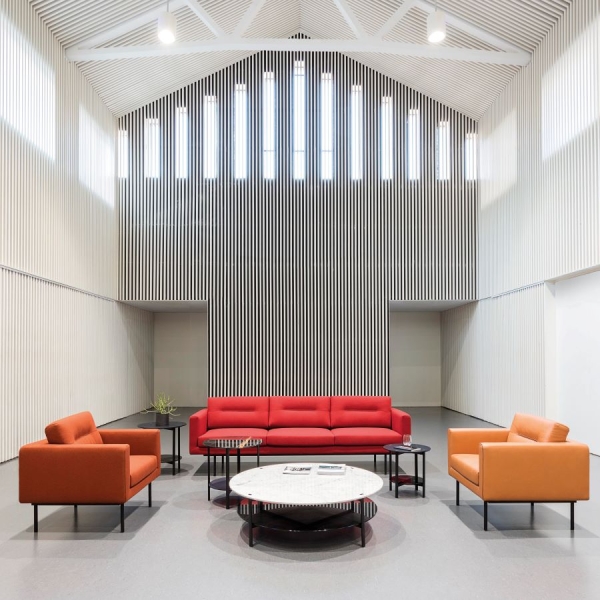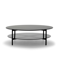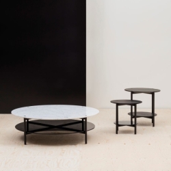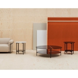 Ruta -sarjaan kuuluu simppeleitä sohva- ja sivupöytiä, joissa on kaksi päällekkäistä pöytätasoa.