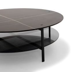 Tämä verkkokauppamme versio on pyöreäkantinen malli ME1997. Sen ylempi pöytätaso on marmoria, ja alataso savulasia.