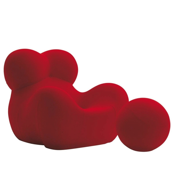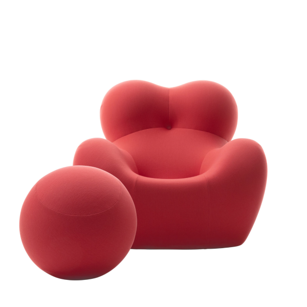 B&B:n UP 5_6 - Big Mamaksikin kutsuttu muodokas nojatuoli kuuluu Gaetano Pescen suunnittelemaan Series Up 2000 sarjaan. Ideansa runsas, leikkisä ja täyteläinen nojatuoli on saanut naisellisen vartalon muodoista, muinaisista hedelmällisyysamuleteista ja sen olemus on vaikuttavan kohtumainen. Ikoniseen, jo vuonna 1969 suunniteltuun, nojatuoliin kuuluu oleellisesti pyöreä, pallomainen rahi, joka on kytketty kiinni tuoliin. Muotoilija Pesce kertookin idean tähän kokonaisuuteen syntyneen siitä ajatuksesta että nainen on ikäänkuin aina ollut oman naiseutensa ja kehonsa vanki - kuin rangaistusvanki jonka nilkkaan on sidottu raskas pallo. Tämä vaikuttava nojatuoli on parhaimmillaan isoissa tiloissa jolloin sen poptaiteenomaisen kuvaileva muotokieli pääsee parhaiten oikeuksiinsa. UP 5_6 on valmistettu joustavasta kylmäpuristetusta Bayfit-vaahdosta, sen pohja on tukevaa juuttikangasta ja tuolia on saatavilla monilla eri kangasvaihtoehdoilla verhoiltuna. Jos olet kiinnostunut tuolista mutta verhoiltuna toisin, ota yhteyttä suoraan liiikkeisiimme.
