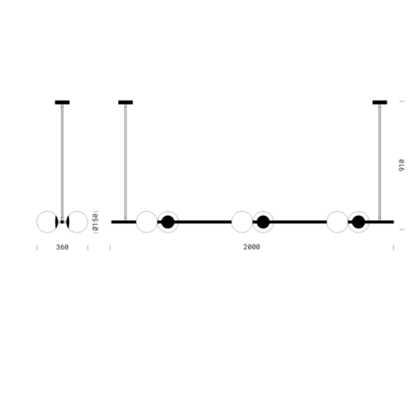 Mitat: valaisinpallon dia 15 cm, korkeus katosta kattokupuineen 91 cm, pituus 200 cm, syvyys 36 cm