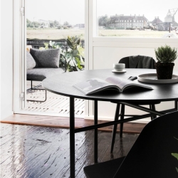 Pöytien jalat on sijoitettu niin että tuoleille ja istujien jaloille jää maksimaalisesti tilaa. Nimensä nämä työ- ja ruokapöydiksi hyvin soveltuvat, modernit huonekalut ovat saaneet kadusta, jolla sijaitsee Norm Architects muotoilutoimiston studio Kööpenhaminassa.