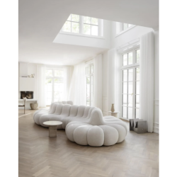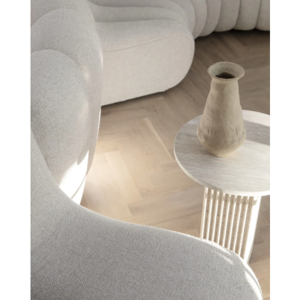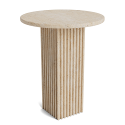 Travertiinista valmistetussa, ylellisessä Soho-pikkupöydässä on pylväs ja pöytälevy, jotka on suunniteltu luomaan kontrastia toisilleen. Ohut ja kevyt pöytälevy luo kontrastia pylvään tukevaan ja uurrettuun jalustaan. Luonnonkivestä valmistetun levyn pinnalla on pieniä onteloita ja epätäydellisyyksiä, ja jokainen levy eroaa toisistaan suonikuvion ja värin suhteen, mikä luo ainutlaatuisia variaatioita jokaiselle pöydälle.