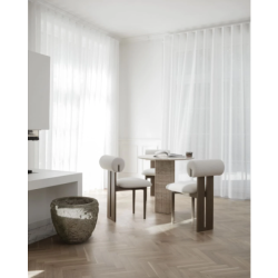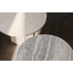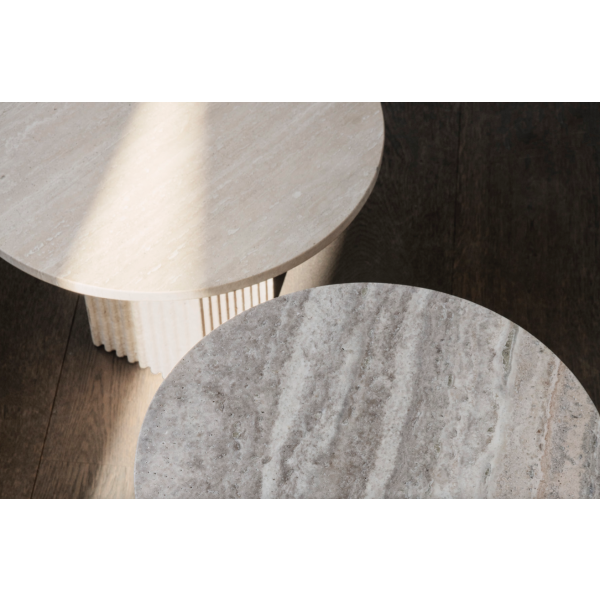 Travertiinista valmistetussa, ylellisessä Soho-pöydässä on pylväs ja pöytälevy, jotka on suunniteltu luomaan kontrastia toisilleen. Ohut ja kevyt pöytälevy luo kontrastia pylvään tukevaan ja uurrettuun jalustaan. Luonnonkivestä valmistetun levyn pinnalla on pieniä onteloita ja epätäydellisyyksiä, ja jokainen levy eroaa toisistaan suonikuvion ja värin suhteen, mikä luo ainutlaatuisia variaatioita jokaiselle pöydälle.