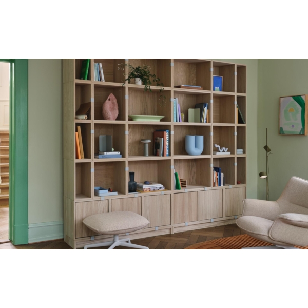 Muuton Stacked on suosittu, innovatiivinen, pienillä metalliklipseillä toisiinsa liitettävistä moduuleista kostuva hyllyjärjestelmä, jonka erikokoisista ja -värisistä osista voit rakentaa ja koota lukemattomia erilaisia yhdistelmiä kotiisi. Kokonaisuuksia voi käyttää niin hyllyinä, kirjahyllyinä, tilanjakajina kuin pikkupöytinäkin.