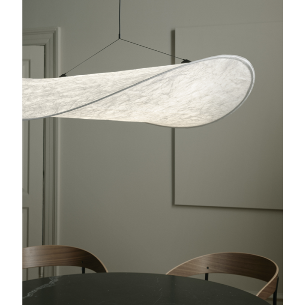 Läpimitaltaan näyttävän kokoinen Tense-riipuvalaisin on kuin pehmeä valaiseva pilvi, joka on leijaillut huoneeseen. Modernia teknologiaa ja innovatiivista materiaalia hyödyntävä, sekä visuaaliselta ilmeeltään tuore ja lempeä Tense-valaisin on jo ehditty palkita Dezeen Award-palkinnolla.