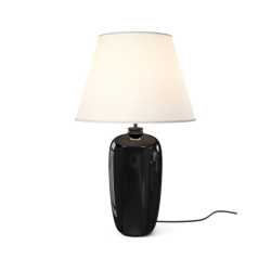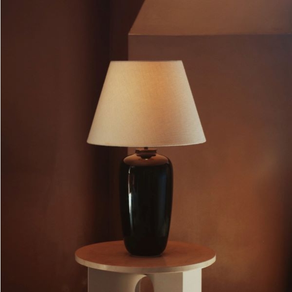 Valasimen keraaminen jalka tuo kontrastia napakan pellavaiselle varjostimelle. Varjostin suodattaa valon kauniisti, ja Torso-pöytävalaisin luo pehmeän lempeää valoa ympärilleen.