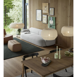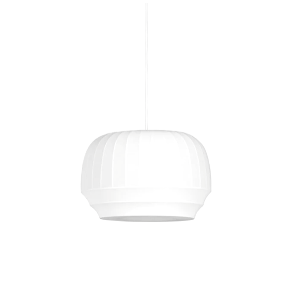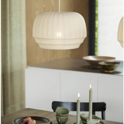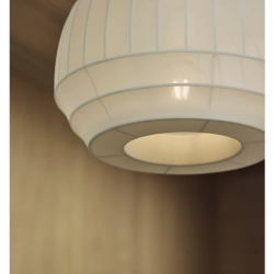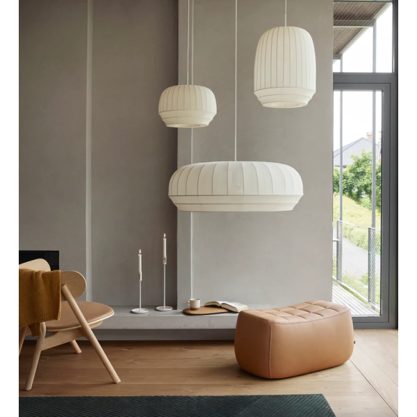 Luonnonvalkoisesta joustinkankaasta valmistettu varjostin venytetään valkoisen metallirungon päälle ennen kuin se kiinnitetään ylä- ja alareunasta. Valaisinta on saatavana kolmessa koossa ja sen irtojohto on myös piilotettu puhtaan silkkijohdon sisään.