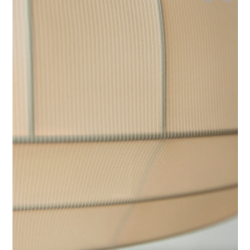 Luonnonvalkoisesta joustinkankaasta valmistettu varjostin venytetään valkoisen metallirungon päälle ennen kuin se kiinnitetään ylä- ja alareunasta.