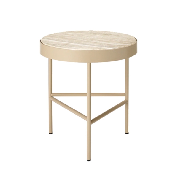 Travertine Table-sivupöytä on lisäys kauniiden ja monikäyttöisten Fermliving Marble-pöytien sarjaan. Travertiinimarmorisen kannen lämmin beige sävy ja luonnonmateriaalin eläväinen pinta luo tyylikkään kontrastin pöydän simppelin industriaaliselle metallirungolle.