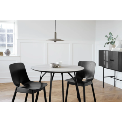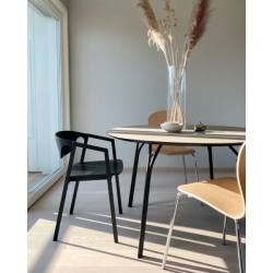 Pyöreä muoto puolestaan kutsuu keskusteluun ja kokoontumisiin perheen ja ystävien kanssa. Siro olemus tekee pöydästä sopivan myös pieniin tiloihin ja keittiöihin.