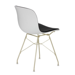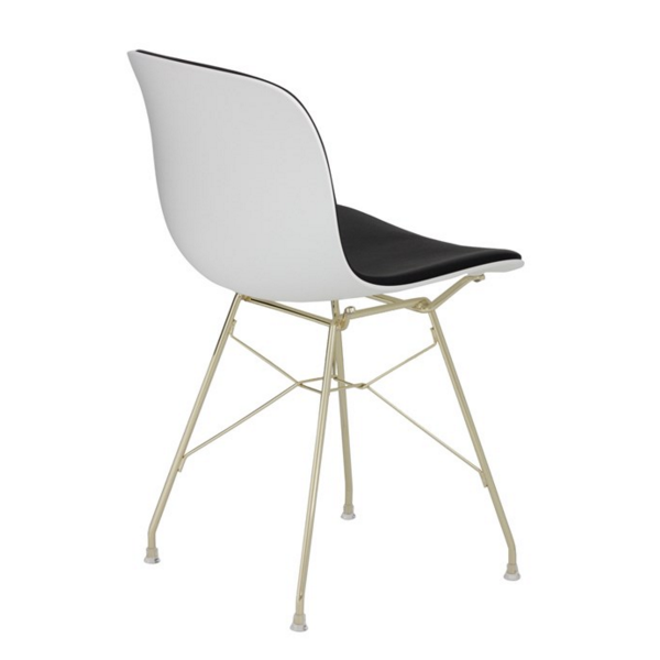 Tässä Troy tuolissa kevyt, kullanvärinen jalkarakenne yhdistyy etuosaltaan verhoiltuun, polypropyleenia olevaan istuimeen. Tuolin olemuksessa on modernin klassikon ainesta ja muoviselkäinen tuoli on aina moderni, tyylikäs ja verhoiltuna mukava valinta kotien pikkutuoliksi, joka toimii sekä ruokapöytien äärellä että yksittäisenä istuimena eteisissä ja makuutiloissa. Tämän muoviselkäisen ja kultajalkaisen, mustalla verhoillun tuolin lisäksi saatavilla on kuparijalkainen, mustaa muovia oleva tuoli, jonka verhoiluvärivaihtoehdoissa on paljon valinnanvaraa, myös nahka. Jos olet kiinnostunut näistä vaihtoehdoista, ota yhteyttä suoraan liikkeisiimme. Saatavilla on myös valko- ja mustajalkainen versio, valkoisella ja mustalla muovitaustalla - näidenkin kohdalla ota yhteyttä liikkeisiimme.