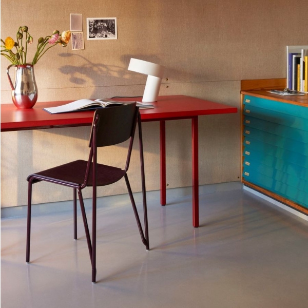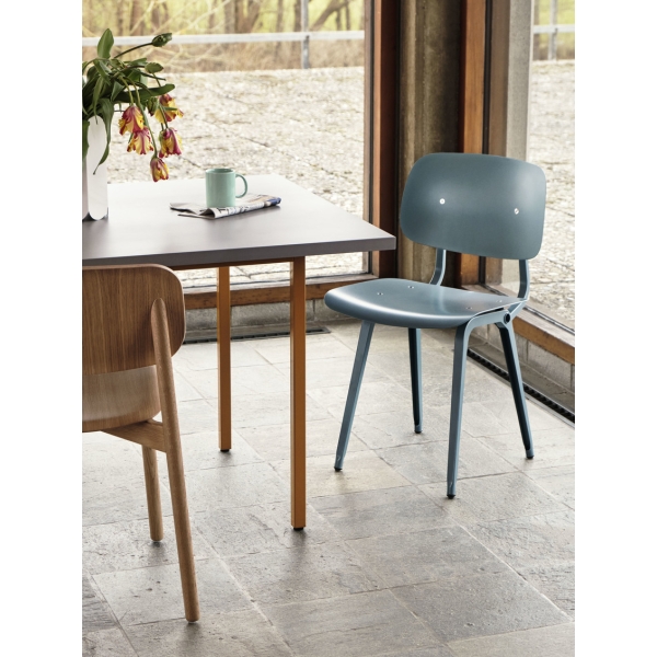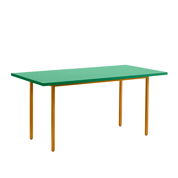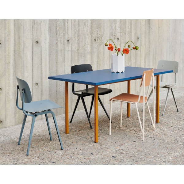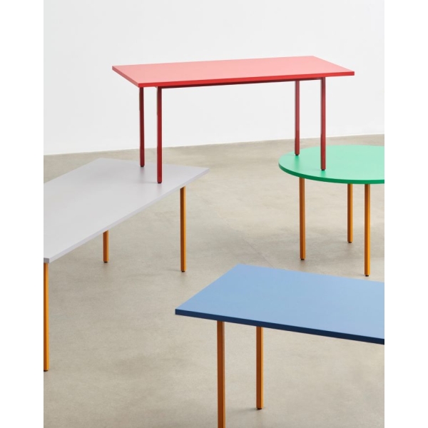 Designer-duo Muller Van Severenin Two-Colour Table -pöydissä leikitellään väreillä, materiaaleilla, kontrasteilla ja yksinkertaisilla muodoilla. Pöydässä robustit teräsputkijalat yhdistyvät Valchomat-komposiittikannen orgaaniseen olemukseen. Yksinkertaiset muodot ja pelkistetyt värit jättävät materiaaleille ja niiden kontrastille tilaa puhutella.