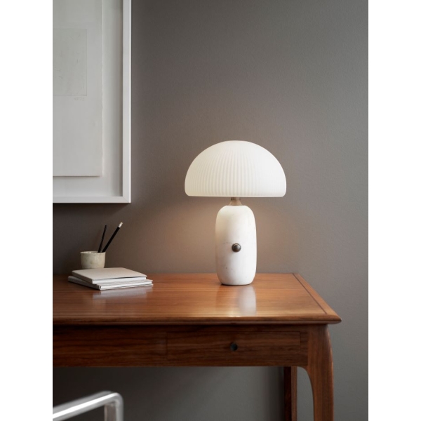VIPP591 Sculpture table lamp toimii valaisimen lisäksi veistoksellisena koriste-elementtinä. Kauniisti uritettu opaalilasinen kupu luo ympärilleen pehmeän tasaista valoa, ja korostaa jalustan marmorin organiista kuviointia. Valaisimen jalustassa on tyylikäs himmennin-katkaisija.