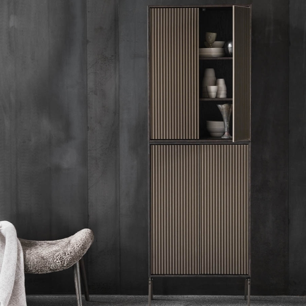 Tämä Vipp 675-kaappi sopii saumattomasti sekä yksityiskoteihin että työympäristöihin, tarjoten korkean ja sirolinjaisen säilytysratkaisun. Tavarat voi kätkeä suulakepuristetusta alumiinista valmistettujen ovien taakse, joissa on integroitu painamalla avautuva mekanismi. Neljä säädettävää hyllyä tarjoavat runsaasti säilytystilaa. Kaappi kohoaa sirojen, eloksoidusta alumiinista valmistettujen metallijalkojen varassa. H4-kaappi edustaa yhtenäistä esteettisyyttä ja tuo esiin hienostuneen materiaalikontrastin orgaanisen ja teollisen välillä.