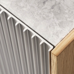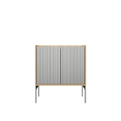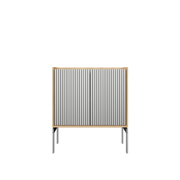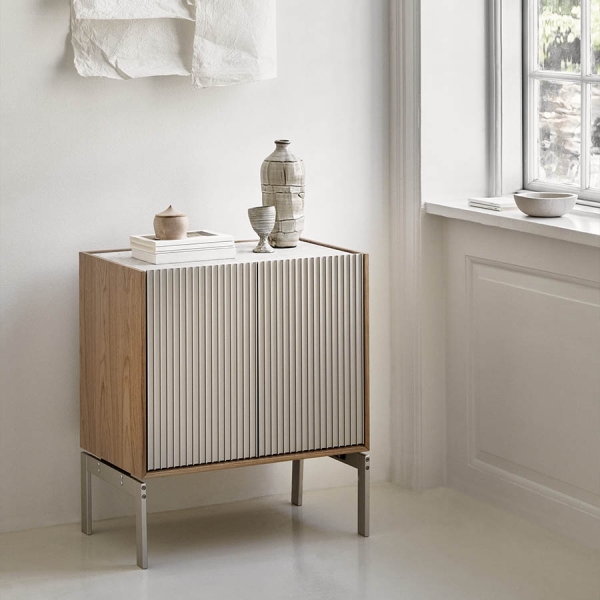 Täydellinen yöpöydäksi, käytävän säilytyskalusteeksi tai sohvapöydäksi – H2-kaappi on yhtä monikäyttöinen kuin veistoksellinenkin. Pienikokoinen mutta aistikkuudeltaan runsas kaappi on valmistettu kolmesta korkealaatuisesta materiaalista: marmorista, eloksoidusta alumiinista ja tammesta. Upotettu marmorialusta – joko tummanharmaa Pietra Grey tai vaaleanharmaa Sky Grey – toimii lähes tarjotinta muistuttavana elementtinä. Uritettujen alumiiniovien takaa löytyy säädettävä hylly.