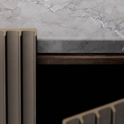 Ihanteellinen yöpöydäksi, eteisen säilytystilaksi tai sohvan sivupöydäksi, tämä H2-kaappi on yhtä monipuolinen kuin veistoksellinenkin. Kaappi on valmistettu kolmesta korkealaatuisesta materiaalista – marmorista, anodisoidusta alumiinista ja tammesta.